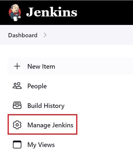 After successful login, navigate to Manage Jenkins option on the left menu as shown below.