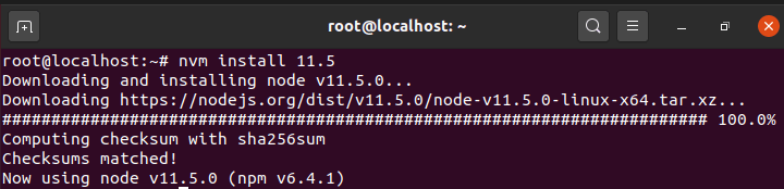 If you want to install any specific Node.js version then you need to use below nvm install command. In this example, we are trying to install Node.js version 11.5 using nvm install 11.5 command.